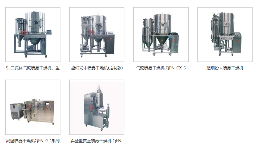 氣流噴霧干燥機型號大全:QFN-E-5 QFN-CX-5 QFN-CX-3 真空噴霧干燥機型號:QFN-VSD-1 高溫噴霧干燥機型號:QFN-GD-1 QFN-GD-3 QFN-GD-5